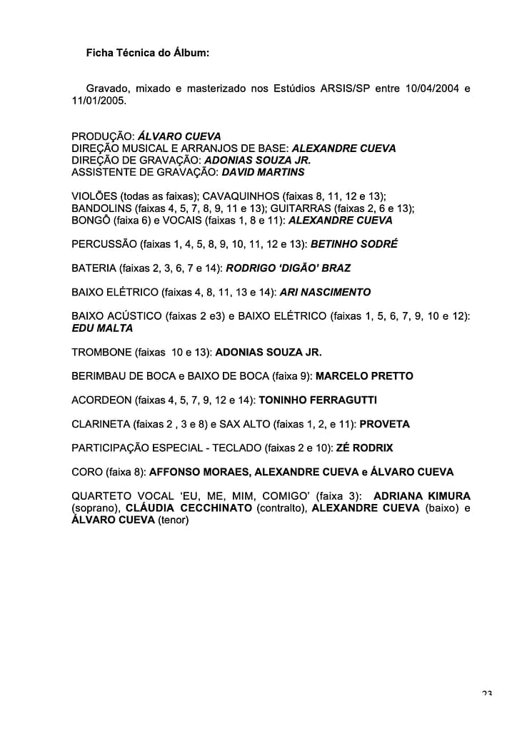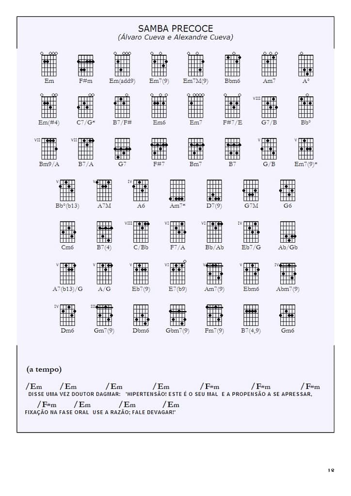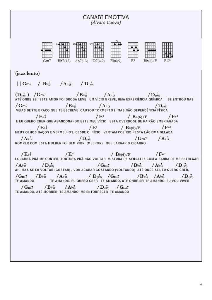 O arquivo PDF traz ao ouvinte a ficha técnica do álbum e as letras cifradas das canções do CD Canabi Emotiva, visando tornar acessível a execução das mesmas por aquele violonista ocasional, que não abre mão de uma harmonia elaborada mas que, assim como o próprio Álvaro Cueva, não tem no violão seu principal meio de comunicação. A adaptação harmônica foi empreendida por Leonardo Costa, violonista e professor de violão do compositor. Prezou-se no trabalho uma adaptação que facilitasse a execução e ao mesmo tempo conservasse as idéias harmônicas originais de Alexandre Cueva. Todas as canções do álbum foram adaptadas com este espírito, exceto SORTE NO AMOR e SAMBA PRECOCE, as quais, por suas peculiaridades, foram cifradas conforme as gravações.